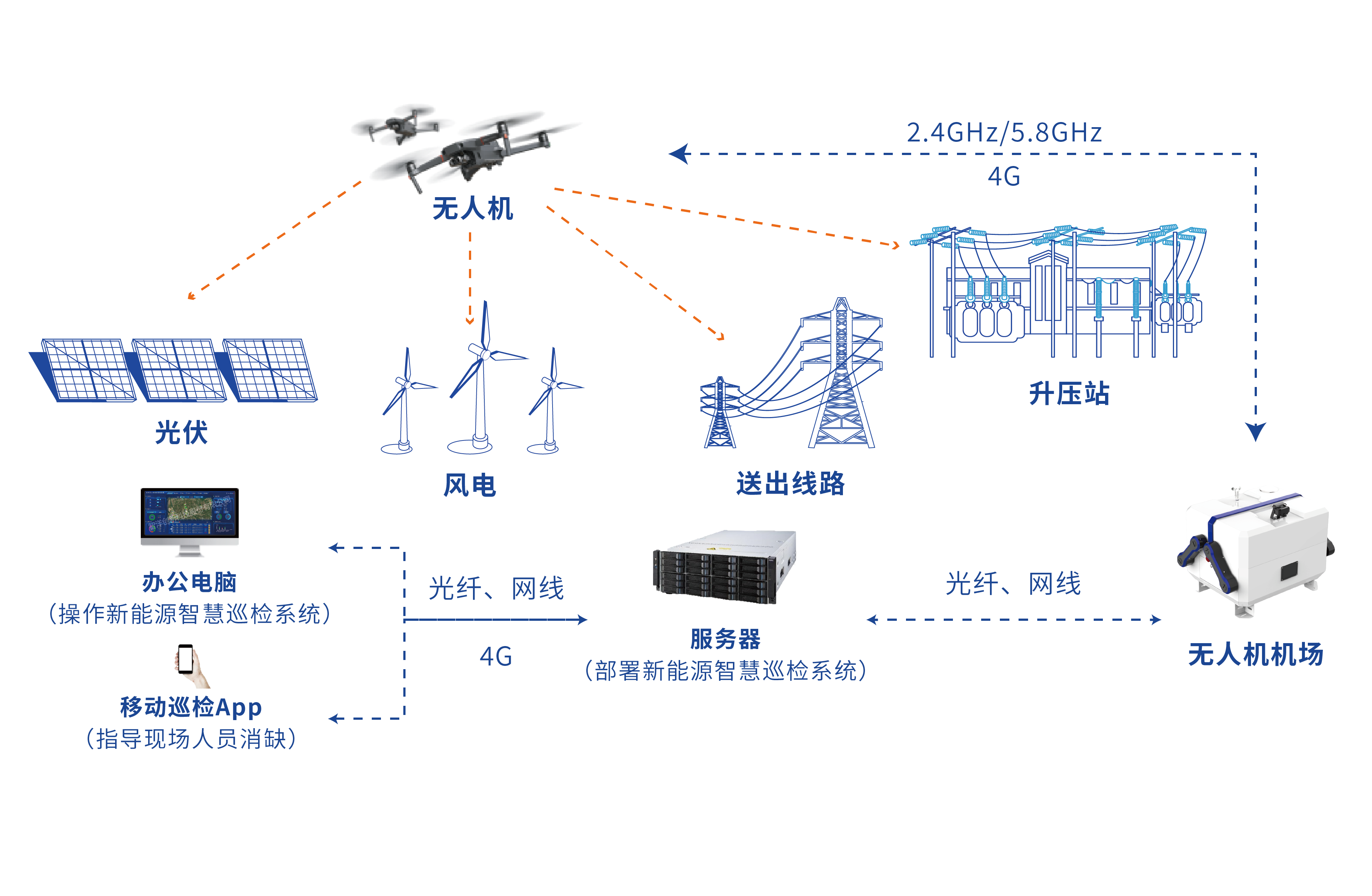 在风电机组、光伏区、升压站和送出线路各场景中,顺利获得无人机与可视化监控装置、各类传感器联合运检的方式,结合人工智能技术自动识别设备、人员、环境异常信息,深度融合新能源场站运检规程,搭建智慧运检管控平台,更快发现现场安全隐患,减轻运维人员巡视压力,提高运维巡视效率,实现场站“无人值守、少人值班、集中监控”。